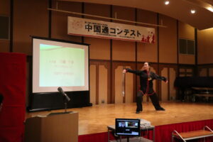 本次大赛根据选手的汉语水平分成入门组、课题组和创作组三个组进行。其中,入门组和课题组的选手来自关西地区的各个中学,创作组的选手中大学生和社会各界的汉语爱好者各占一半。入门组的中学生们虽然学习汉语的时间不长,但他们比较标准的发音、精心的舞台语言设计获得了观众和评委的连连称赞;课题组的选手形象生动地讲述了中国成语故事;创作组的选手则是独立创作演讲稿,或激情昂扬,或娓娓道来,或生动起伏,或饱含深情地讲述了个人学习汉语中的故事和难以忘怀的中日民间交流中的愉快体验,显示出了选手们高水平的汉语表达能力和促进中日友好交流的美好意愿。为了让选手们摘掉口罩在台上全情投入,主办方在消毒防疫方面做足了准备:比赛全程舞台上只有选手一人;选手与台下观众席的评委之间保持足够的安全距离;每一次使用过后,都对话筒进行消毒,比赛过程中也多次对舞台台面进行全面消毒。全部演讲结束之后,设有“知识问答”环节,内容涵盖了汉语知识、汉语流行语、中医文化等多个领域,以中日文化有机结合的文学作品为背景资料,突出中医特色,以语言文化带动中医传播。今年的中医题目围绕中穴位展开,让与会选手和嘉宾感受到了中医的魅力。