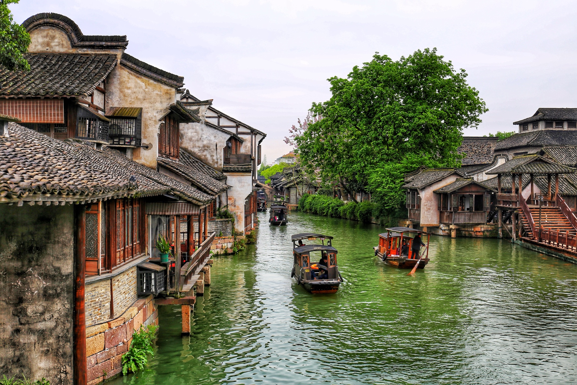 中国江南地方特有な水郷風景であり、伝統的な木造建築と緑に囲まれた運河、そしてのんびりと進む小舟で、時間がゆっくり流れているような感覚になります。
